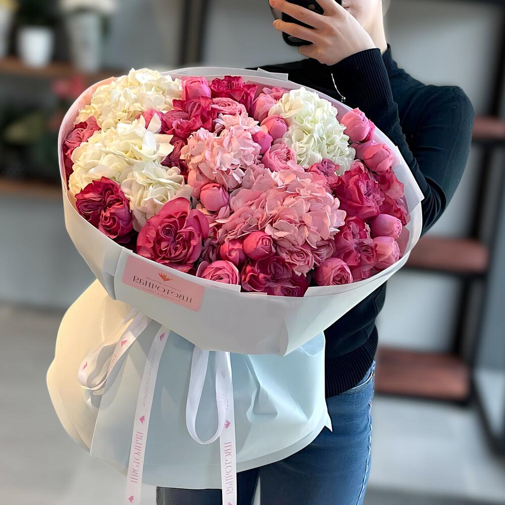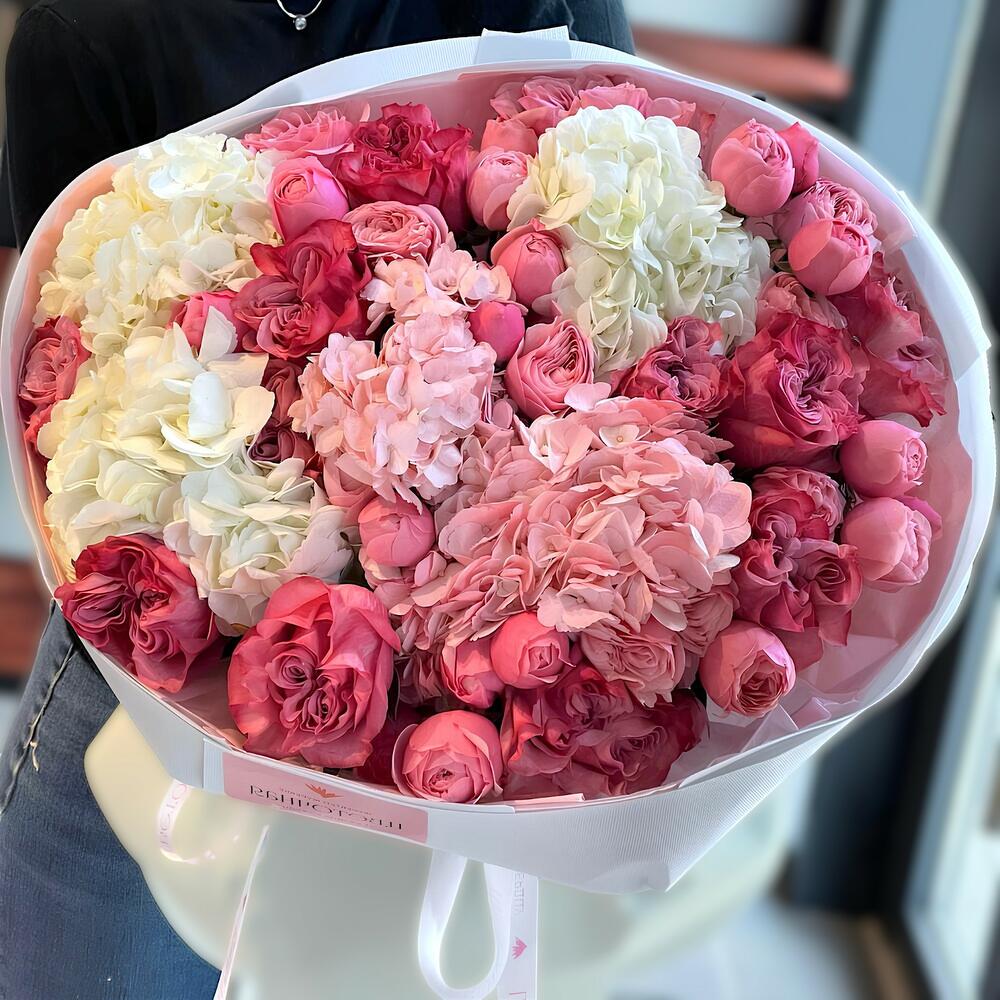 Гортензия - 5 шт. пионовидные розы - 11 шт. кустовые пионовидные розы - 9 шт.