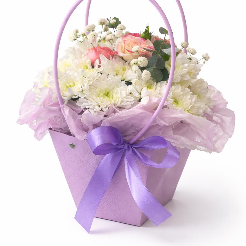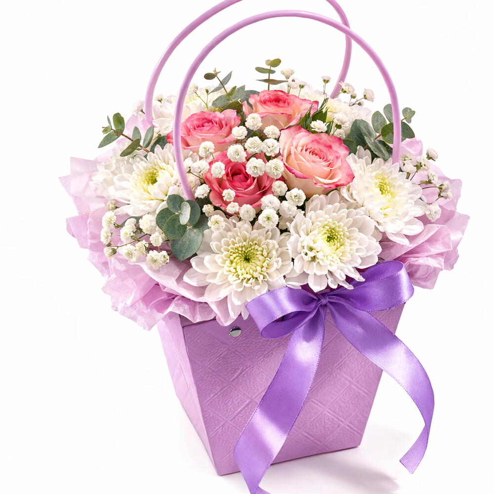 Роза кустовая - 1 шт. Хризантема кустовая - 2 шт. Роза - 1 шт. Эустома - 1 шт. Диантус - 1 шт. Эвкалипт Цинерея - 1 шт.