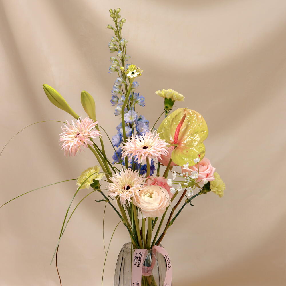 Этот букет — как музыкальная импровизация в цветах: яркие аккорды голубых дельфиниумов, нежные мелодии розовых гербер и ранункулюсов, антуриум, лилии и игривые нотки аллиум. Композиция подчёркивает лёгкость и воздушность — будто цветы только что сорвались с ветра. Букет упакован в белую бумагу и белую коробку с тематической открыткой по запросу. Состав цветов на фото — примерный, но букет будет в изображенной цветовой гамме, настроении и размере. На фото размер М.