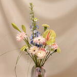Антуриум - 1 шт. Лилия - 1 шт. Ранункулюс - 1 шт. Аллиум - 1 шт. голубой дельфиниум - 1 шт. розовый гербера - 1 шт.