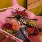 Хризантема кустовая - 3 шт. трайфлы - 4 шт. французские розы 60 см - 5 шт. зелень и лизиантус - 3 шт.
