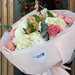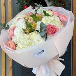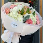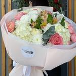 Альстромерия - 2 шт. Гортензия - 3 шт. Хризантема кустовая - 3 шт. Роза - 7 шт. Кустовая роза - 2 шт.