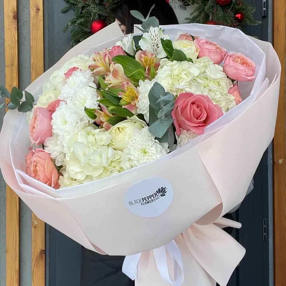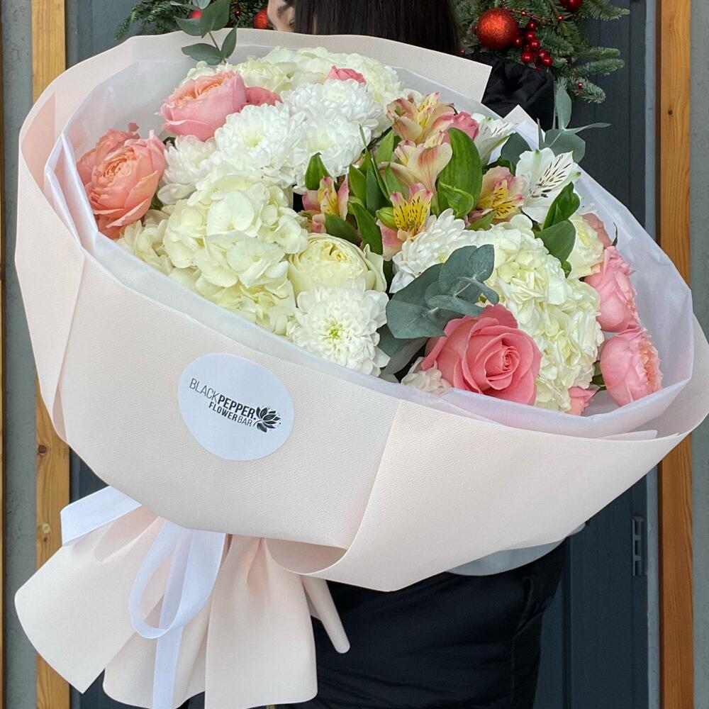 Этот изысканный авторский букет, в сборе которого участвовали различные сорта цветов, станет неповторимым акцентом в каждом интерьере. Он выражает изысканный вкус и оригинальность. Яркие и нежные цвета альстромерии в паре с элегантной гортензией придают композиции неповторимую красоту. В композицию гармонично вписываются пышные хризантемы, а душистый аромат розы и кустовой розы оставляет неизгладимые впечатления. С таким букетом любой сюрприз или поздравление станет незабываемым!
