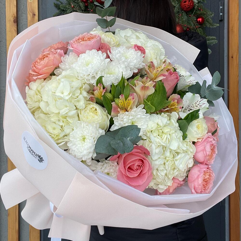Альстромерия - 2 шт. Гортензия - 3 шт. Хризантема кустовая - 3 шт. Роза - 7 шт. Кустовая роза - 2 шт.