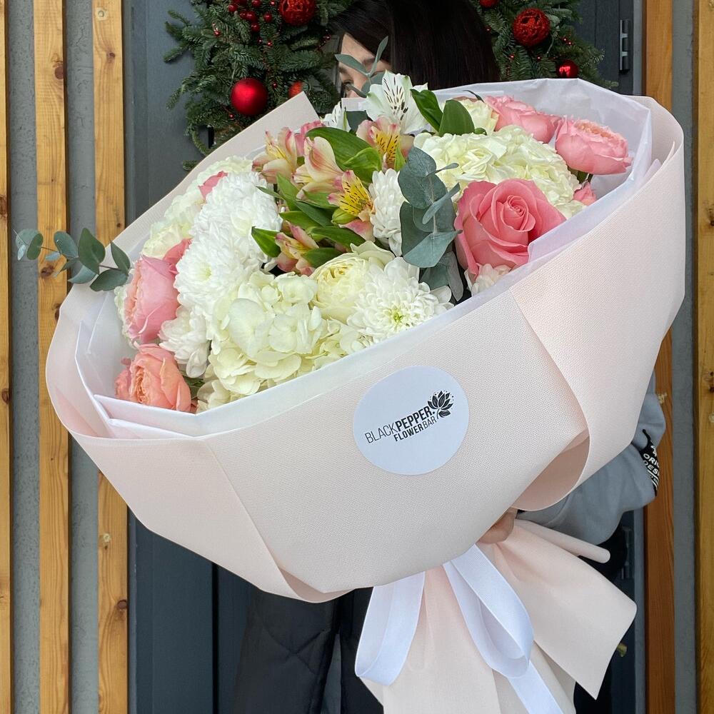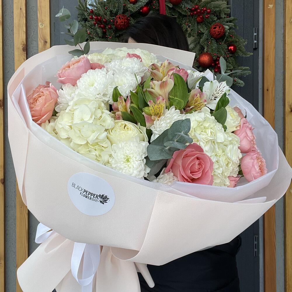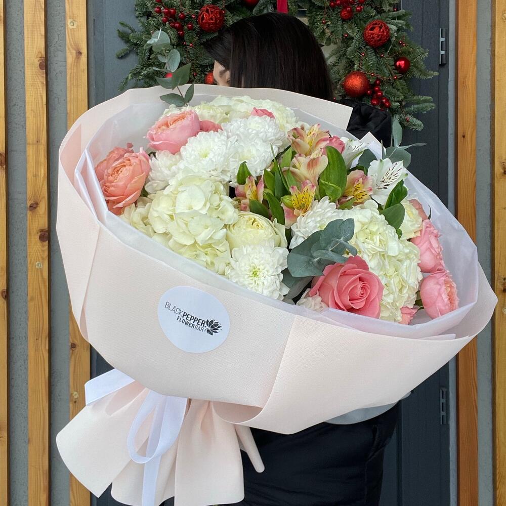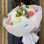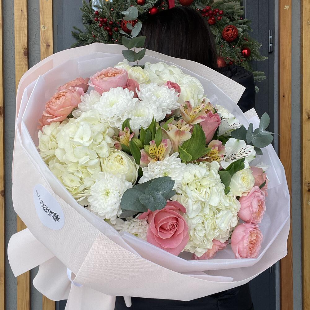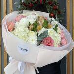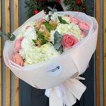 Альстромерия - 2 шт. Гортензия - 3 шт. Хризантема кустовая - 3 шт. Кустовая роза - 2 шт. розы - 7 шт.