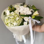 Альстромерия - 2 шт. Гортензия - 1 шт. Хризантема кустовая - 5 шт. Эвкалипт - 2 шт. Роза - 8 шт. Лилия Белая - 1 шт.
