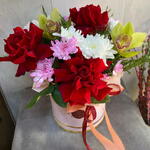 Хризантема кустовая - 2 шт. Коробка шляпная - 1 шт. орхидея - 2 шт. Упаковка дизайнерская - 1 шт. Роза французская - 3 шт. Оазис флористический - 1 шт. Можжевельник - 1 шт.