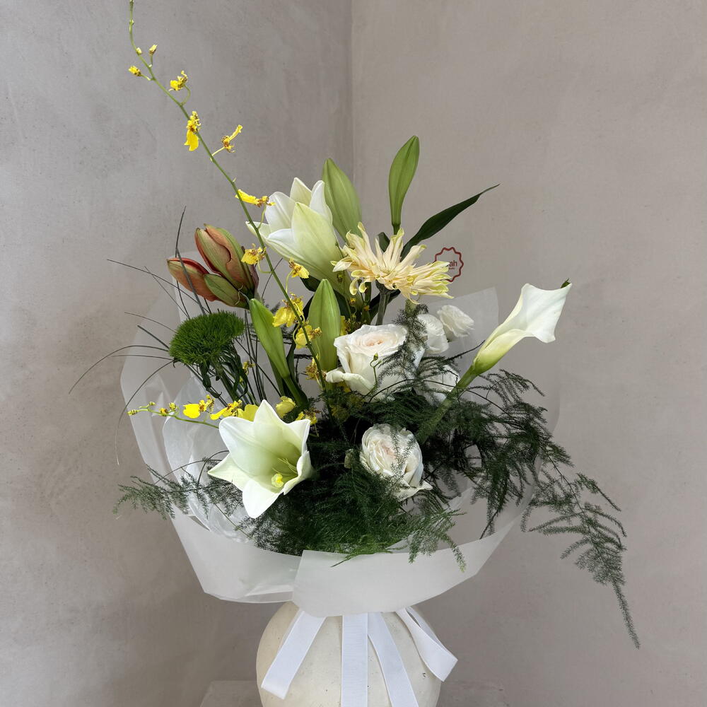 Амариллис - 1 шт. Калла - 1 шт. Лилия - 2 шт. Эустома - 1 шт. Гербера - 1 шт. Аспарагус - 2 шт. Пионовидная роза - 2 шт. гвоздика грин - 1 шт. онцидиум - 1 шт.