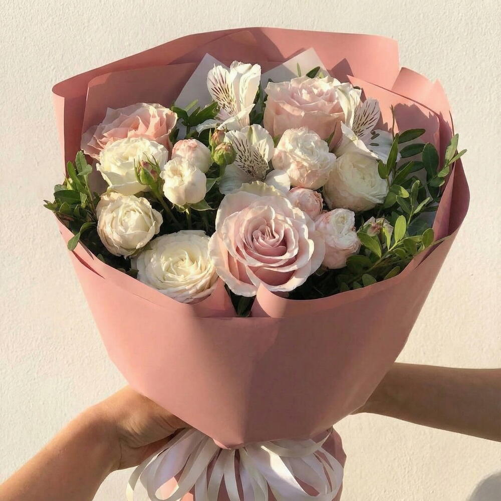 Альстромерия - 3 шт. Роза кустовая - 3 шт. Зелень - 1 шт. Французская роза - 3 шт. Авторская упаковка - 1 шт.
