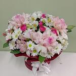 Французская нега» — букет в коробке Воздушная и утончённая композиция из нежно-розовых французских роз, изящных спрей-роз, хризантем и альстромерий. Лёгкая палитра пастельных оттенков создаёт ощущение мягкости и спокойствия, а каждый цветок словно шепчет о любви, заботе и душевной теплоте. Идеальный выбор для трогательных моментов, признаний или просто чтобы порадовать близкого человека.