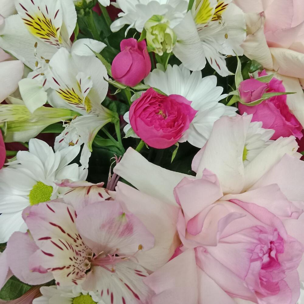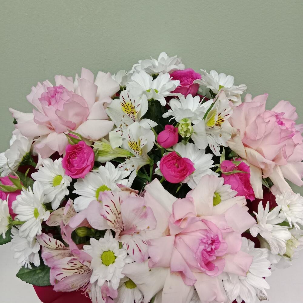 Французская нега» — букет в коробке Воздушная и утончённая композиция из нежно-розовых французских роз, изящных спрей-роз, хризантем и альстромерий. Лёгкая палитра пастельных оттенков создаёт ощущение мягкости и спокойствия, а каждый цветок словно шепчет о любви, заботе и душевной теплоте. Идеальный выбор для трогательных моментов, признаний или просто чтобы порадовать близкого человека.