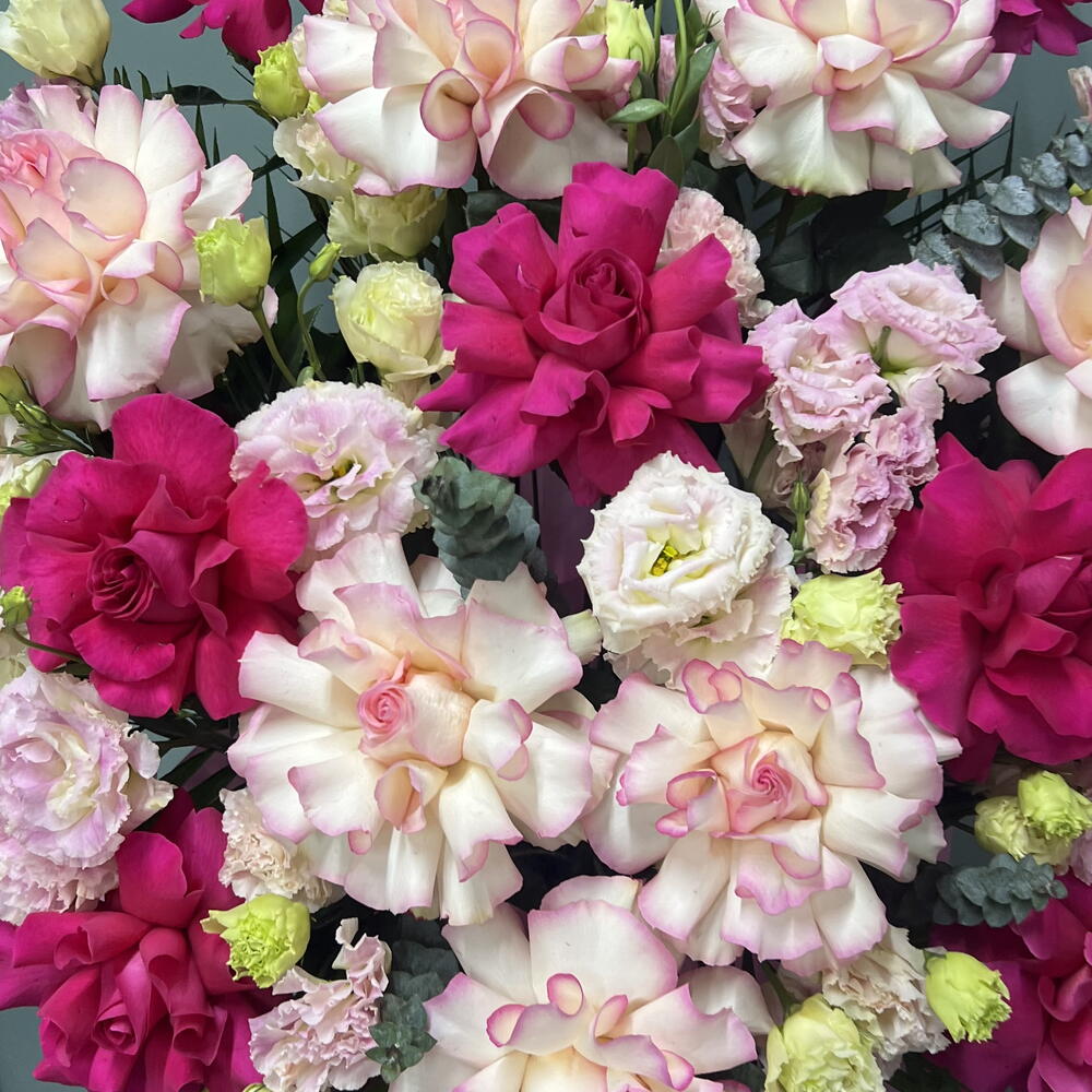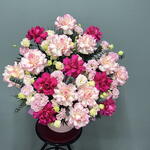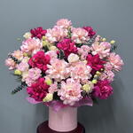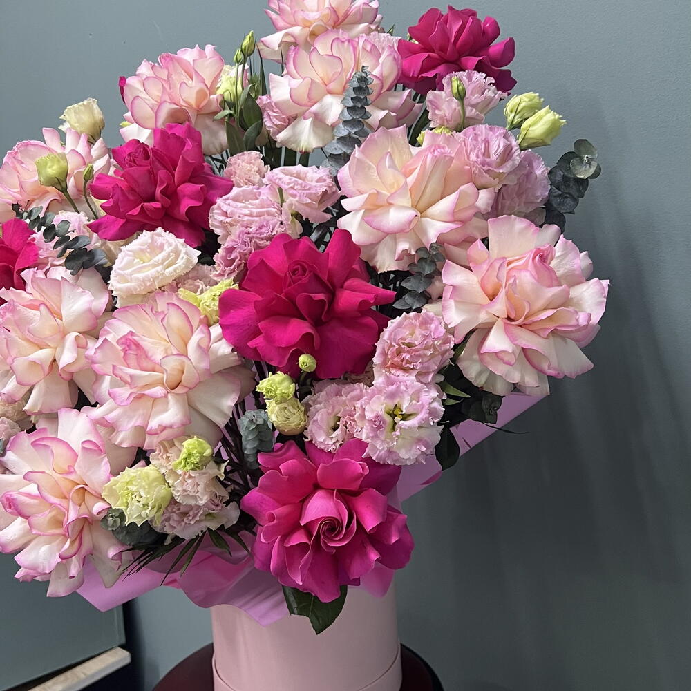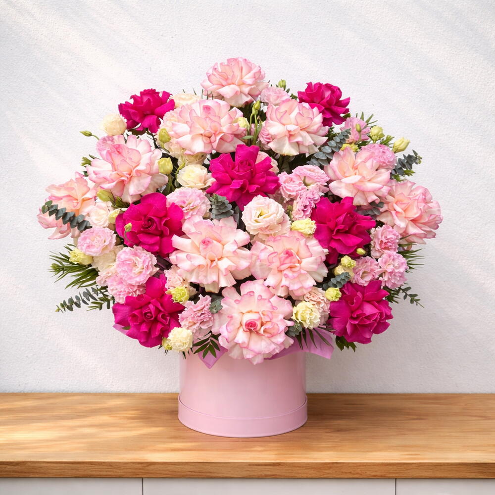 «Французские розочки в коробке» — это стильная и элегантная цветочная композиция премиум-класса в шляпной коробке, созданная для тех, кто ценит утончённость и изысканный вкус. Нежная палитра розовых и кремовых оттенков гармонично сочетается с сочной зеленью, создавая воздушный и благородный образ. В центре внимания — 10 роз сорта «Эсперанса» с изящными лепестками и мягким градиентом цвета. Их дополняют 7 роз «Пинк Экспрешн» с выразительным насыщенным оттенком, придающим композиции глубину и характер. Завершают ансамбль 9 пышных лизиантусов, добавляющих лёгкость, романтичность и объём.
