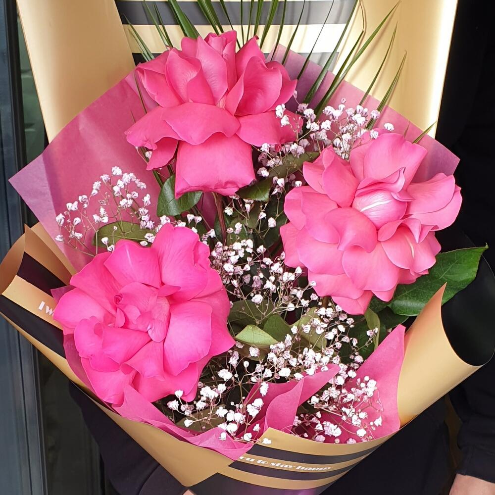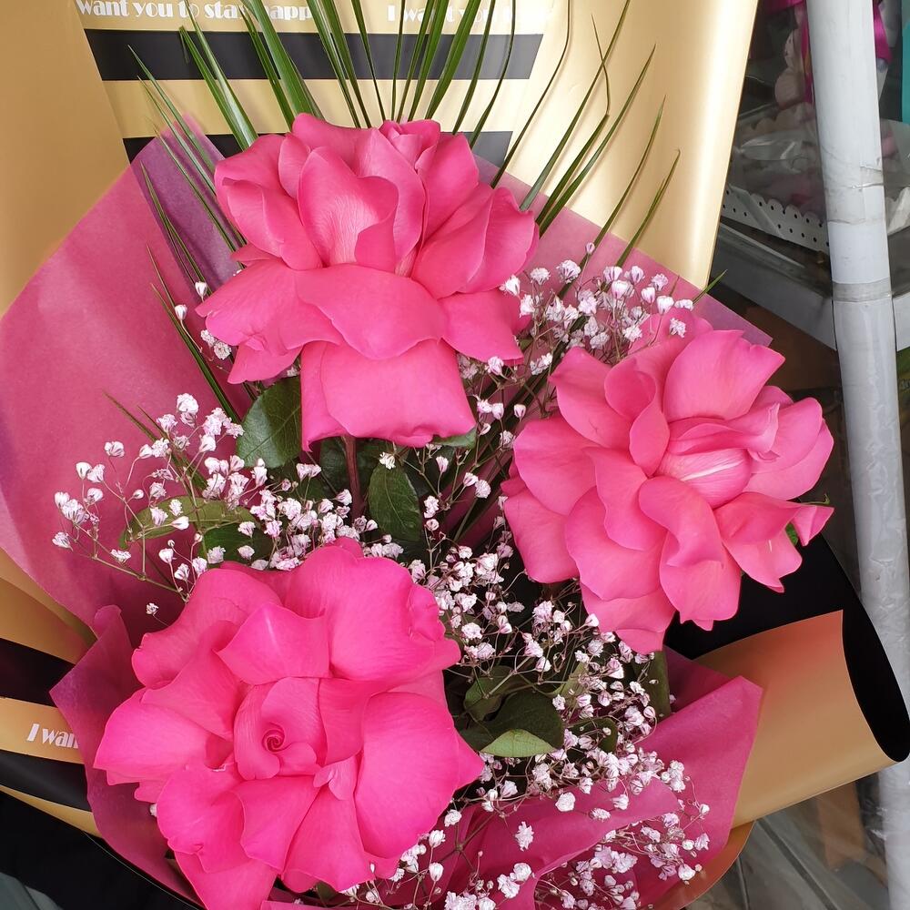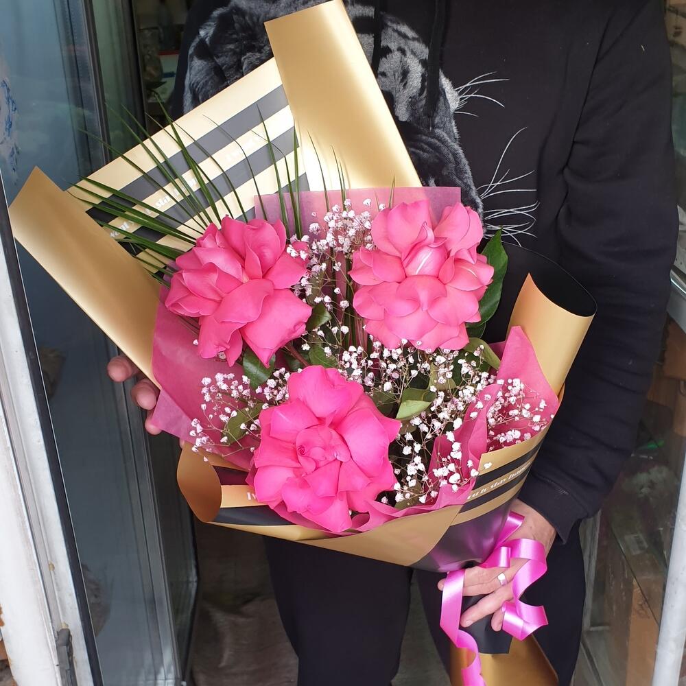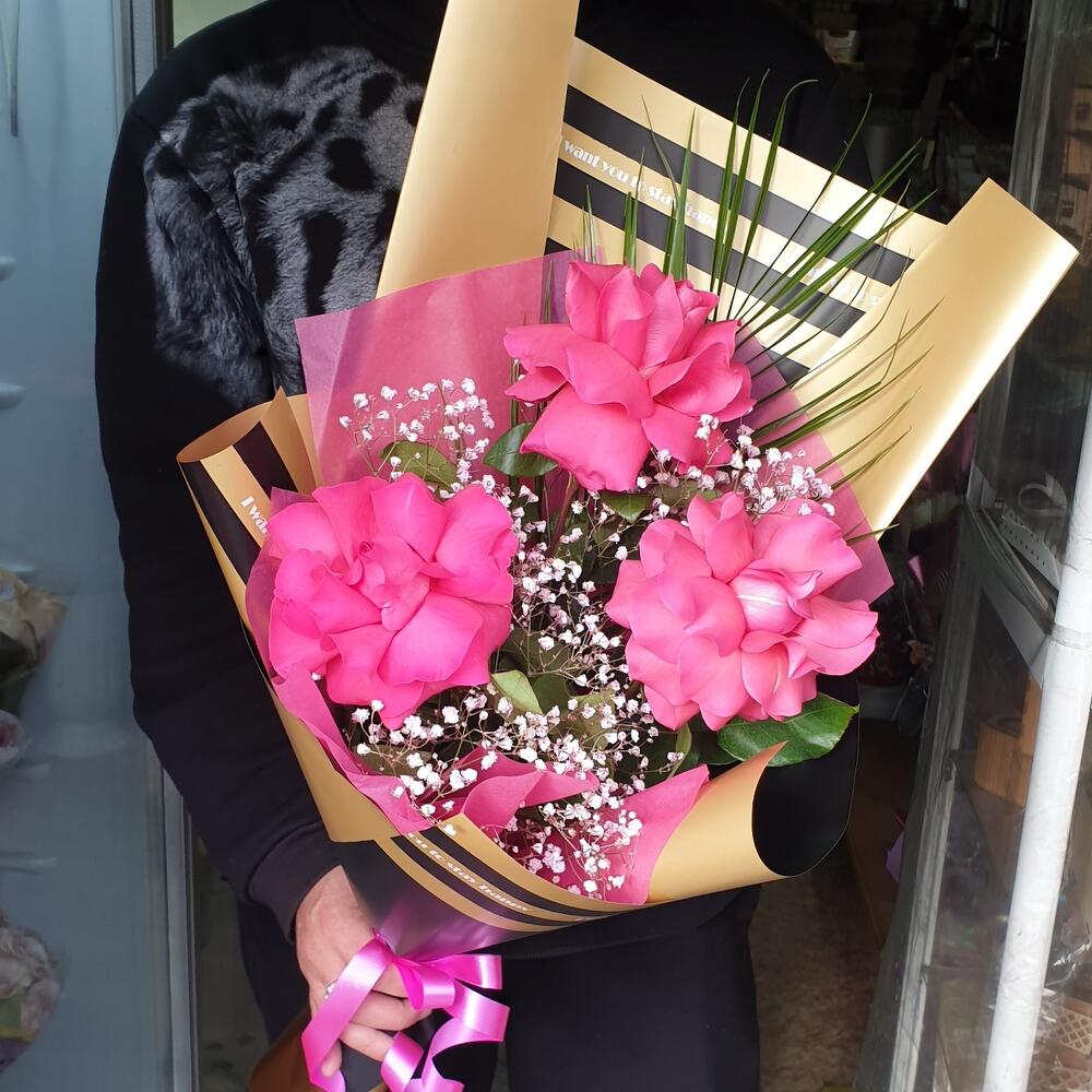 Упаковка дизайнерская - 3 шт. гипсофила цветная - 1 шт. робелини лист - 1 шт. французские розы - 3 шт.