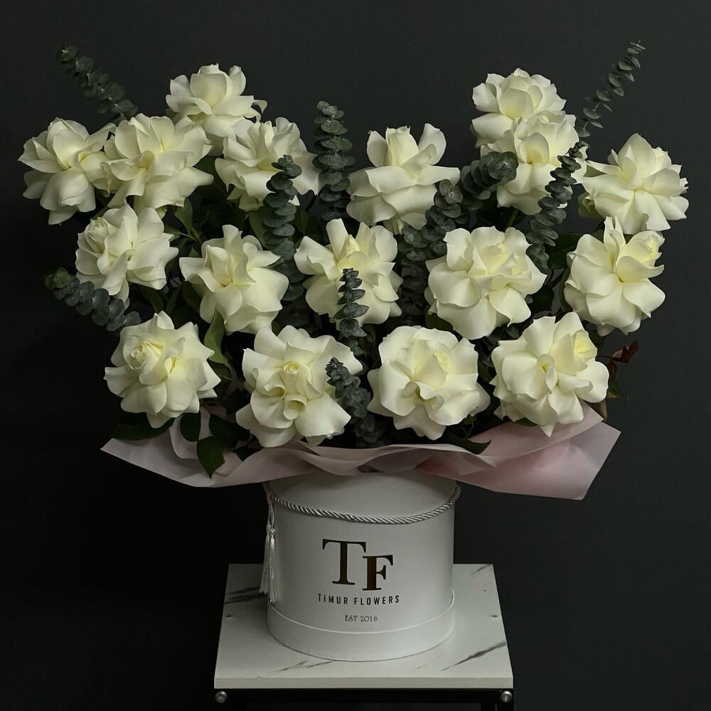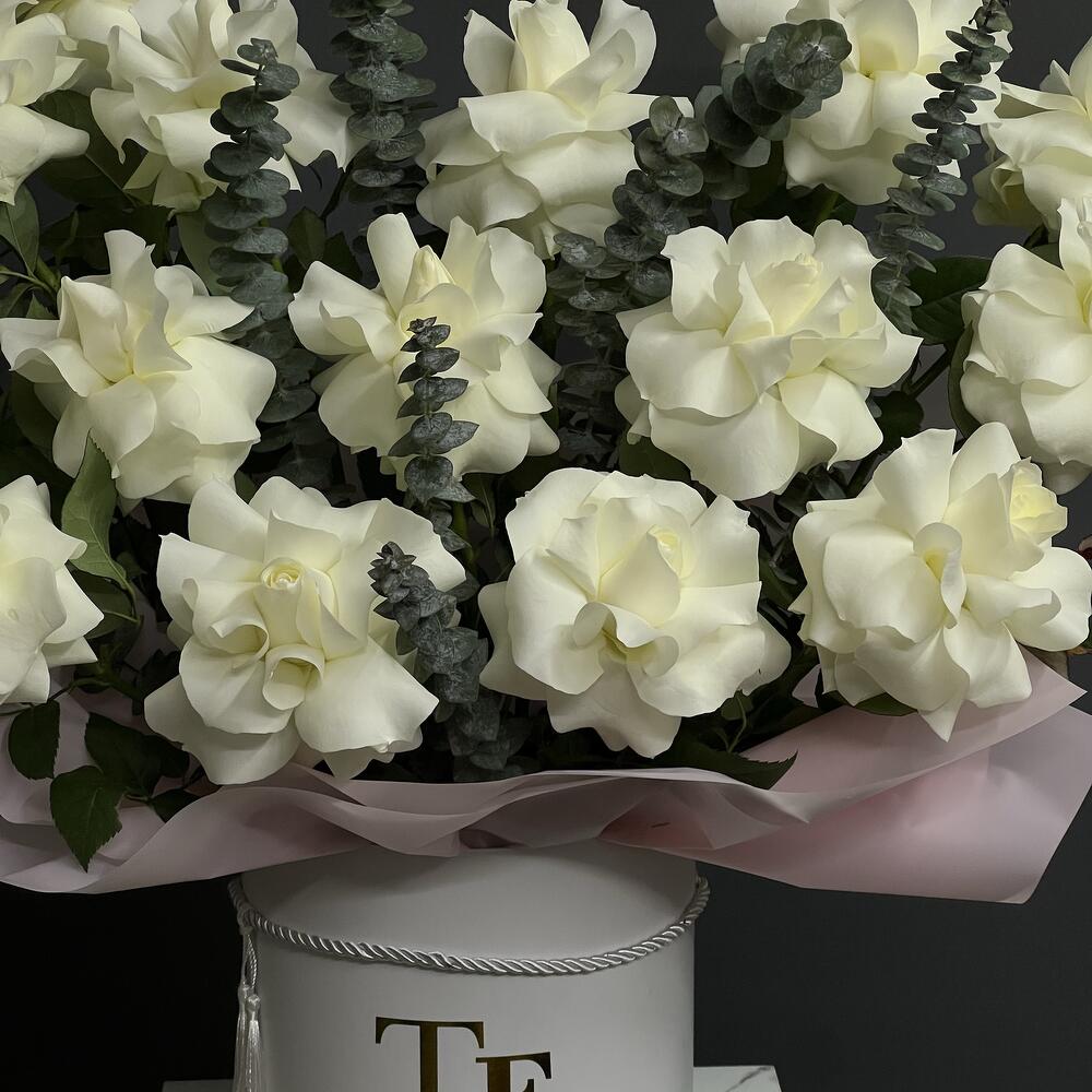 Эвкалипт - 5 шт. Французская роза - 17 шт. Оазис флористический - 2 шт. Тубус - 1 шт. матовая салфетка - 2 шт.