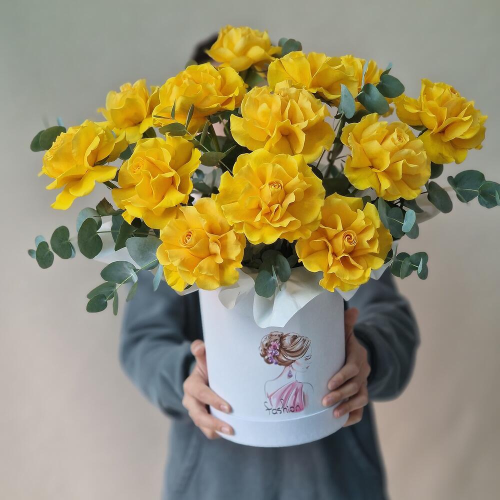 Эвкалипт - 11 шт. Коробка шляпная - 1 шт. сортовая роза - 11 шт.