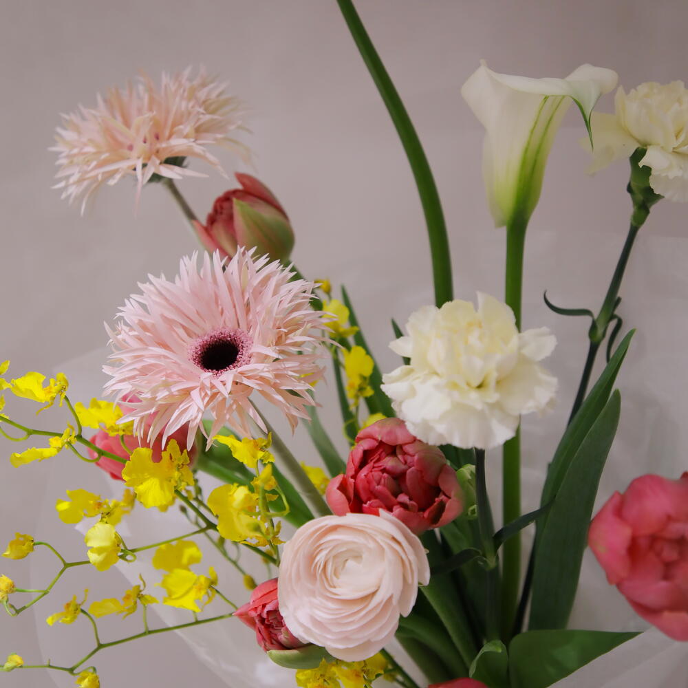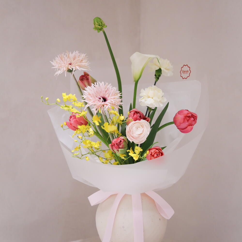 Калла - 1 шт. Тюльпан - 6 шт. Гвоздика - 2 шт. Гербера - 2 шт. Орнитогалум - 1 шт. Ранункулюс - 1 шт. онцидиум - 1 шт.