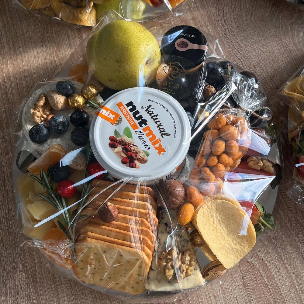 Клубника - 80 гр. Виноград - 50 гр. Голубика - 50 гр. Чипсы - 50 гр. Мед - 1 шт. Оливки - 5 шт. Сыр пармезан - 50 гр. Маслины - 5 шт. арахисовая паста - 1 шт. орешки микс - 100 гр. сыр dorblu с голубой плесенью - 50 гр. сыр камамбер упаковка - 1 шт. тук соленые с сыром - 50 гр. арахис в оболочке - 100 гр.
