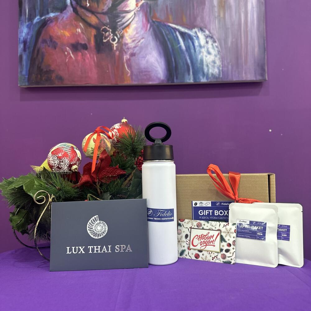 Подарочный бокс от «Fidelio» — это идеальное сочетание удовольствия, заботы и функциональности. В наборе: Сертификат на массаж в премиальном спа-салоне «Lux Thai Spa», который подарит расслабление и гармонию вашему телу и душе. Термос со штативом, который станет незаменимым спутником для утреннего кофе, прогулок или работы в путешествии. Два дрип-пакета с ароматным кофе, чтобы начать день с энергии и удовольствия, где бы вы ни находились. Такой подарок подчеркнет вашу заботу и внимание к деталям, даря моменты радости и уюта! Подарочный бокс от «Fidelio» — это идеальное сочетание удовольствия, заботы и функциональности. В наборе: Сертификат на массаж в премиальном спа-салоне «Lux Thai Spa», который подарит расслабление и гармонию вашему телу и душе. Термос со штативом, который станет незаменимым спутником для утреннего кофе, прогулок или работы в путешествии. Два дрип-пакета с ароматным кофе, чтобы начать день с энергии и удовольствия, где бы вы ни находились. Такой подарок подчеркнет вашу заботу и внимание к деталям, даря моменты радости и уюта! Номинал сертификата - 20,000