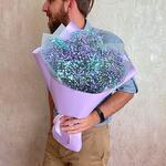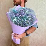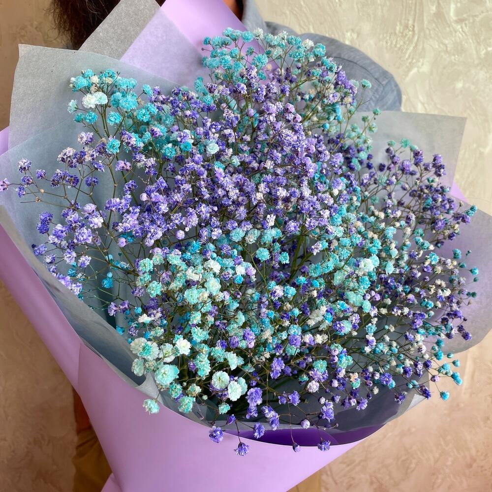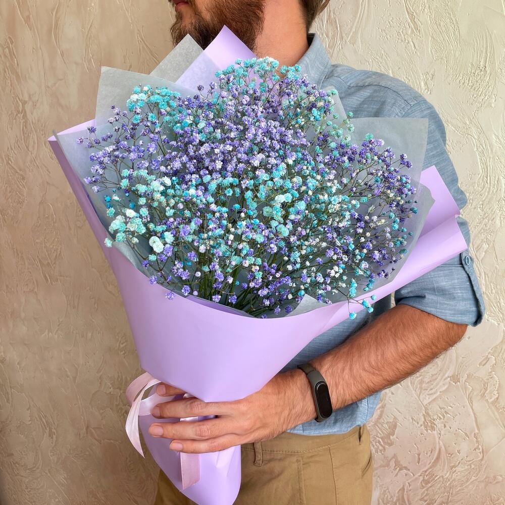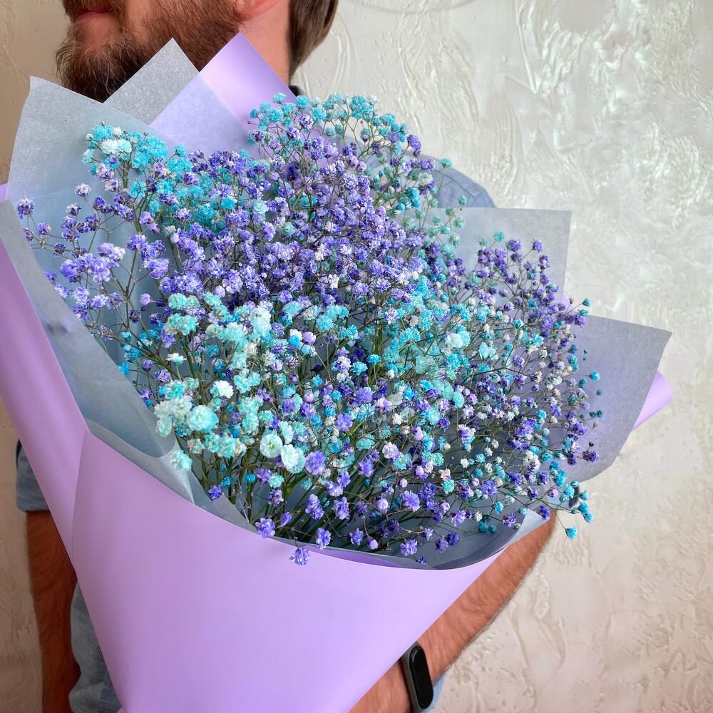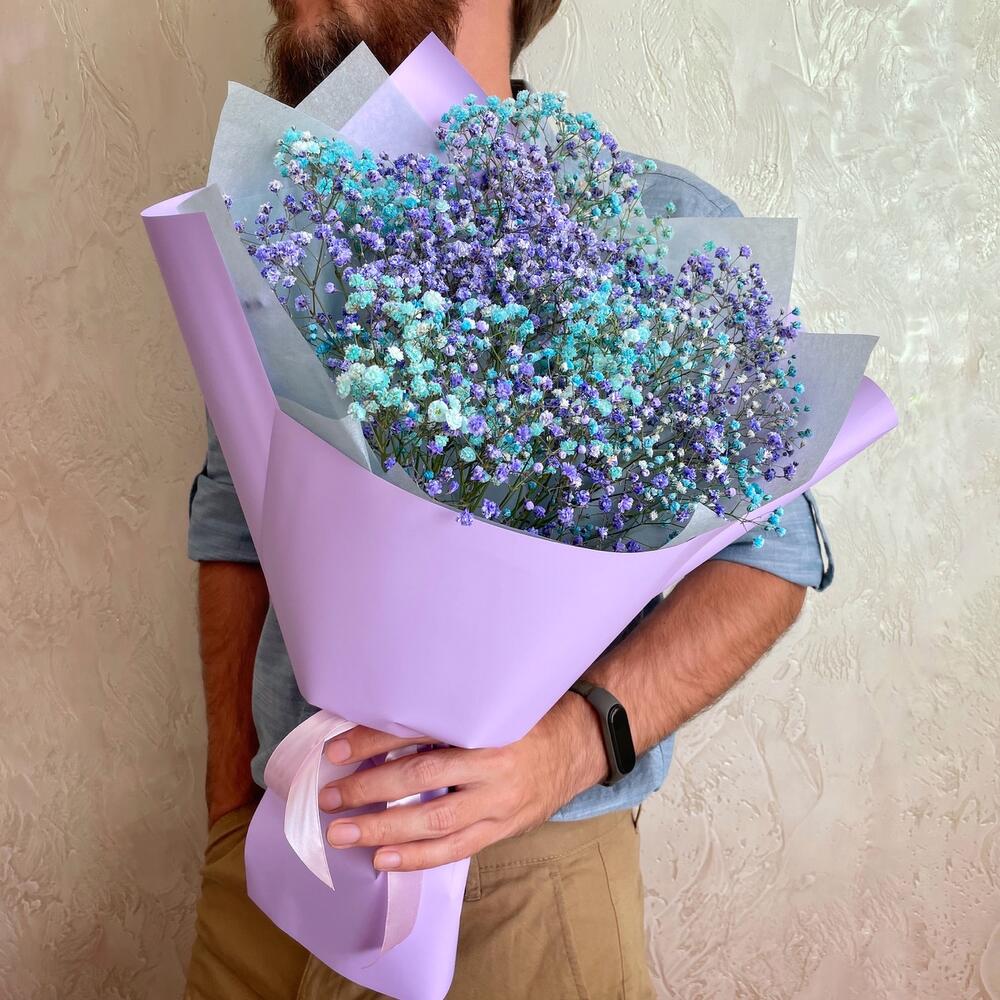 Лента атласная - 1 шт. Упаковка тишью - 2 шт. гипсофила сиреневая - 3 шт. упаковка пленка цветная - 3 шт. гипсофила аква - 4 шт.