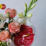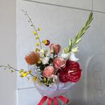 Антуриум - 1 шт. Эустома - 1 шт. Нутан - 1 шт. Пионовидная роза - 3 шт. Гладиолус - 1 шт. Львиный зев - 1 шт. онцидиум - 2 шт.
