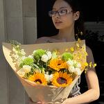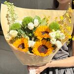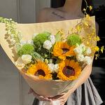 Дельфиниум - 1 шт. Эустома - 5 шт. Подсолнух желтый - 3 шт. барбатус - 3 шт. орхидея ондициум - 1 шт.