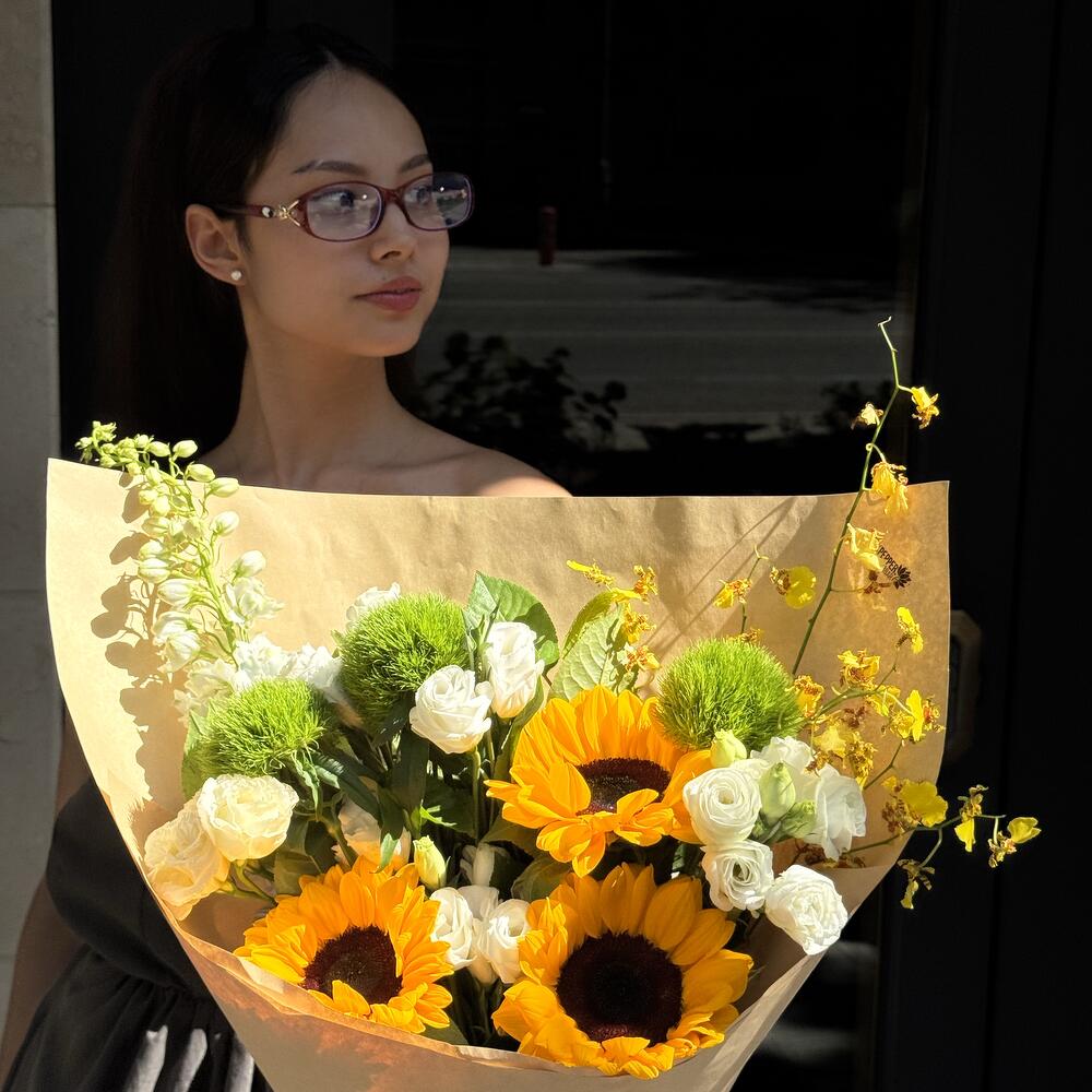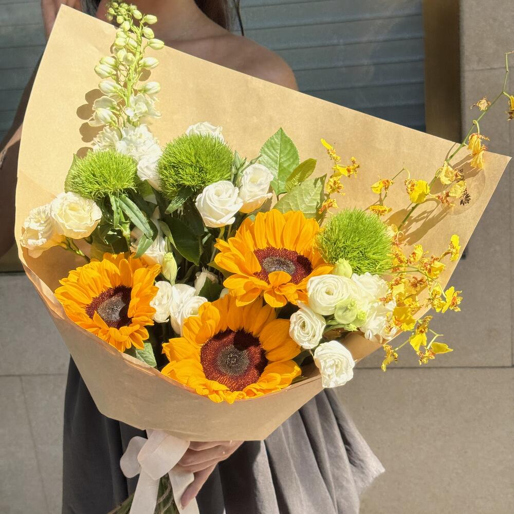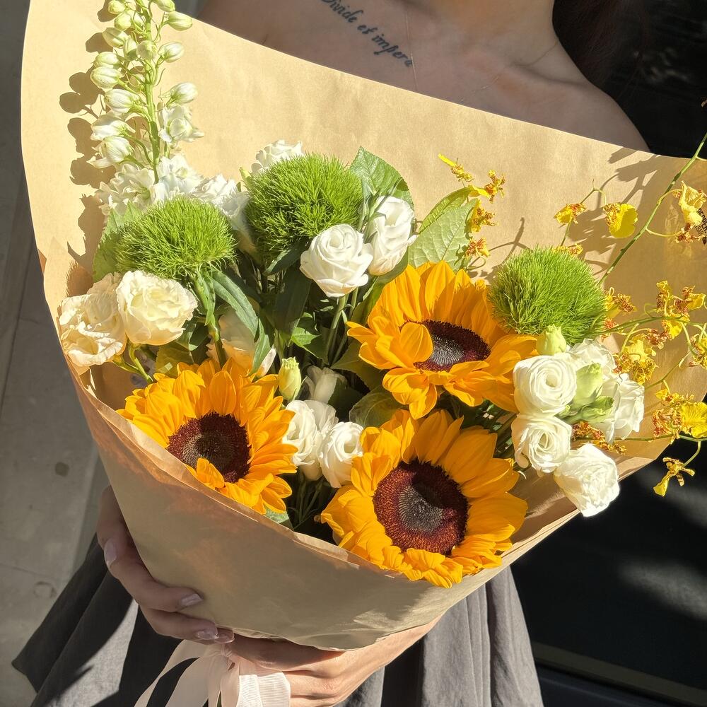 Дельфиниум - 1 шт. Эустома - 5 шт. Подсолнух желтый - 3 шт. барбатус - 3 шт. орхидея ондициум - 1 шт.