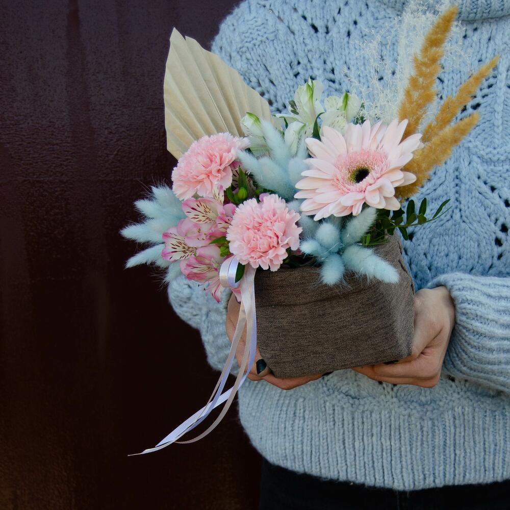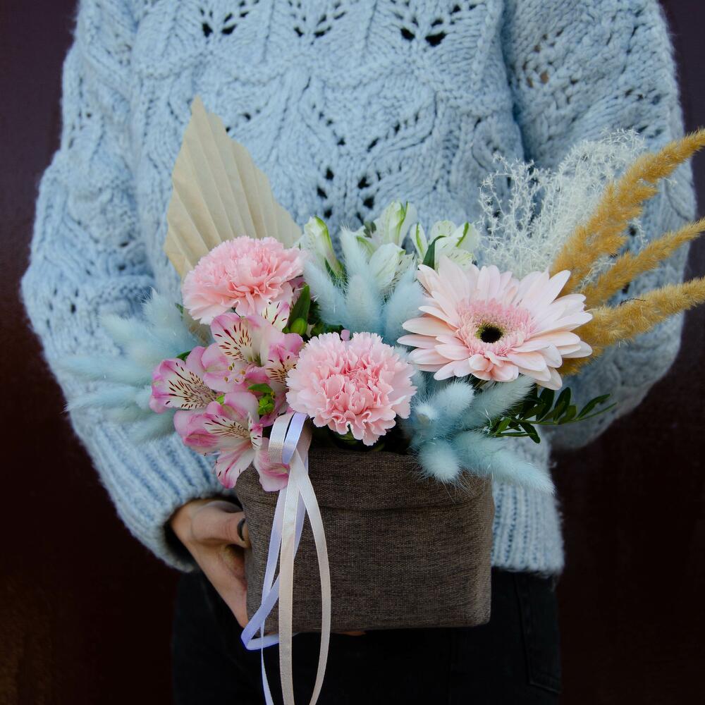 Альстромерия - 2 шт. Маттиола - 2 шт. Гвоздика - 2 шт. Лагурус - 1 шт. Мешочек - 1 шт. копье - 1 шт.