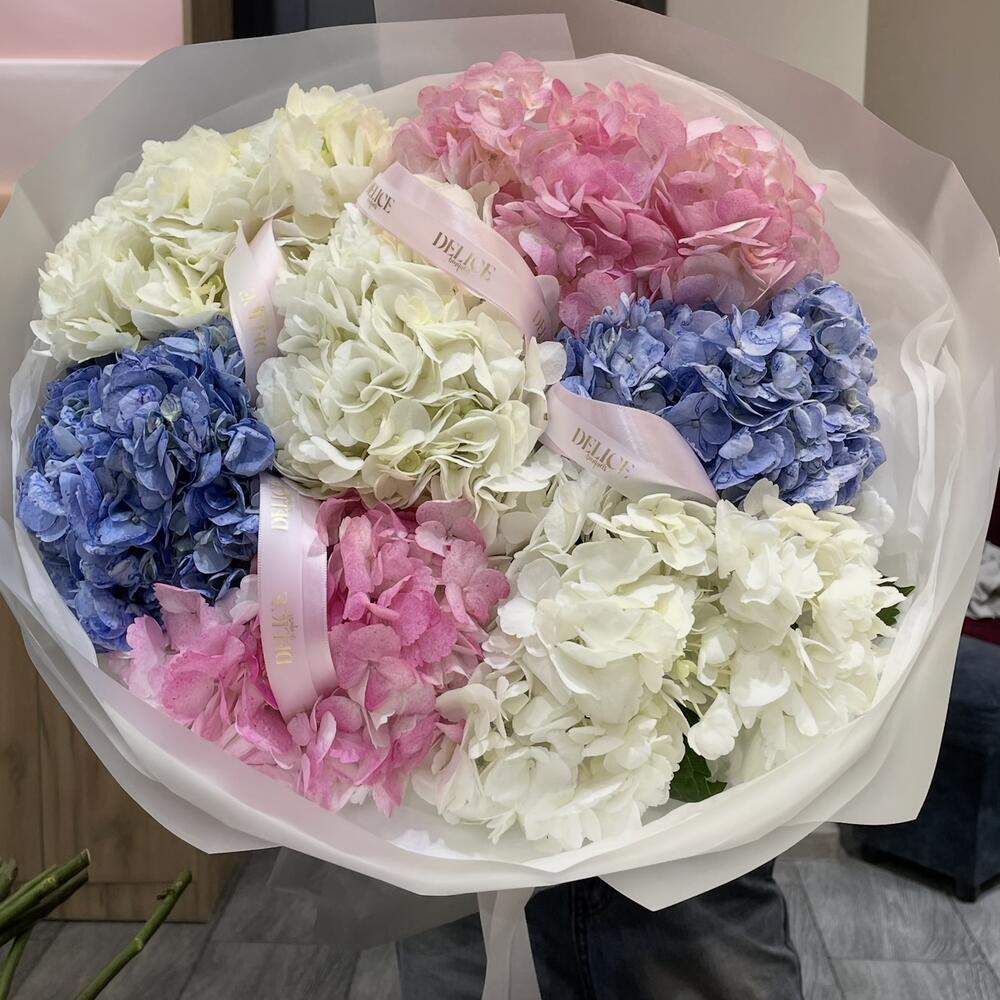белые гортензии - 4 шт. розовые гортензии - 2 шт. синие гортензии - 2 шт.