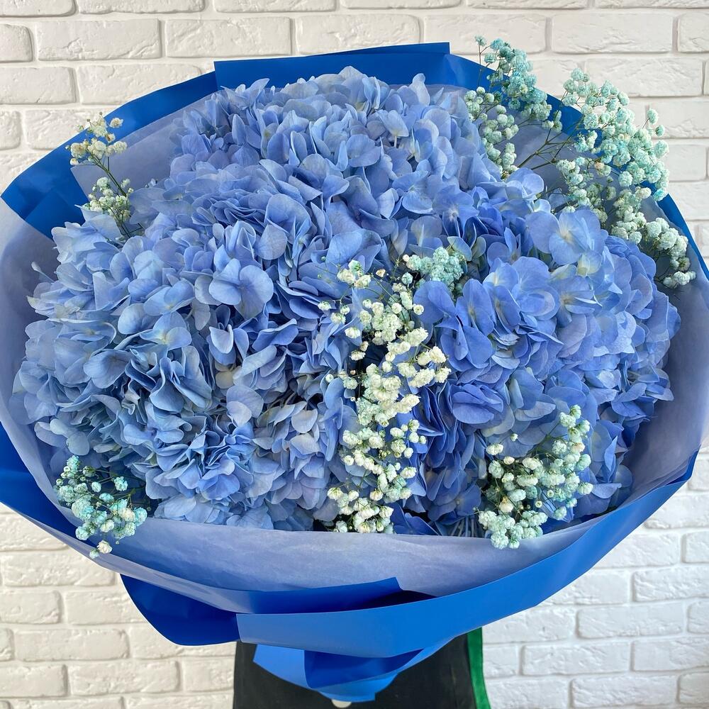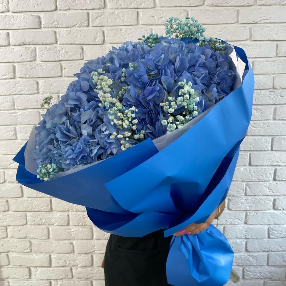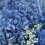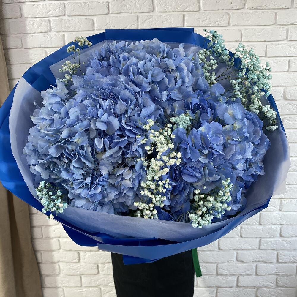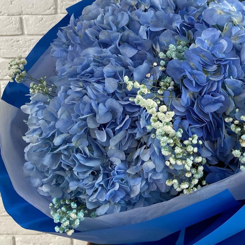 Гипсофила - 2 шт. Гортензия голубая - 3 шт. Оформление - 6 шт. Лента репсовая - 1 шт.