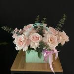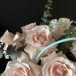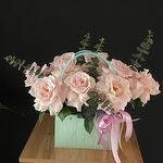 Эвкалипт - 2 шт. Лента атласная - 2 шт. Тишью - 1 шт. Роза французская - 11 шт. Оазис флористический - 1 шт. крафт пакет с ручками - 1 шт.