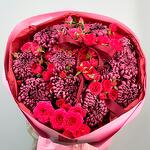Энергия и страсть собраны в одном букете. Роскошные бордовые хризантемы в обрамлении ярко-розовых кустовых роз — это смелая игра цветов и текстур. Глубокий красный акцент подчеркивает торжественность, а изящный бант добавляет утонченности. Этот букет станет выразительным посланием для тех, кто ценит страсть и красоту в каждом моменте.