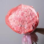 Гвоздика - 21 шт. Лента атласная - 1 шт. Упаковка дизайнерская - 3 шт. Кризал (подкормка) - 1 шт.