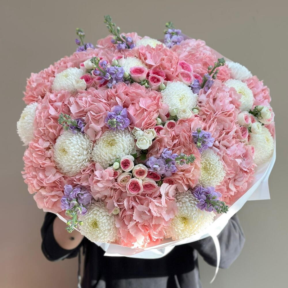 Гортензия - 15 шт. Маттиола - 10 шт. Хризантема кустовая - 13 шт. Кустовая роза - 10 шт.