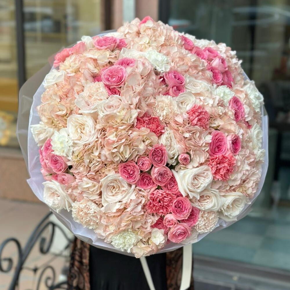 Гортензия - 15 шт. Кустовая роза - 15 шт. Гвоздика кустовая - 20 шт. white ohara роза - 25 шт.