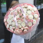 Этот нежный букет словно облако из элегантных белых хризантем и воздушных розовых пионовидных роз. Он излучает романтику, лёгкость и изысканность, идеально подойдёт для поздравления с особым событием или как трогательный знак внимания. Гармония белого и розового создаёт ощущение нежности и утончённости, а плотная форма букета придаёт ему роскошный и праздничный вид. Такой букет обязательно оставит тёплые воспоминания и подчеркнёт важность момента. Рекомендации по уходу: ставьте букет в чистую вазу с прохладной водой, обновляйте её ежедневно и подрезайте стебли под углом. Держите цветы вдали от прямых солнечных лучей и сквозняков. При желании хризантемы можно слегка опрыскивать водой для сохранения свежести.