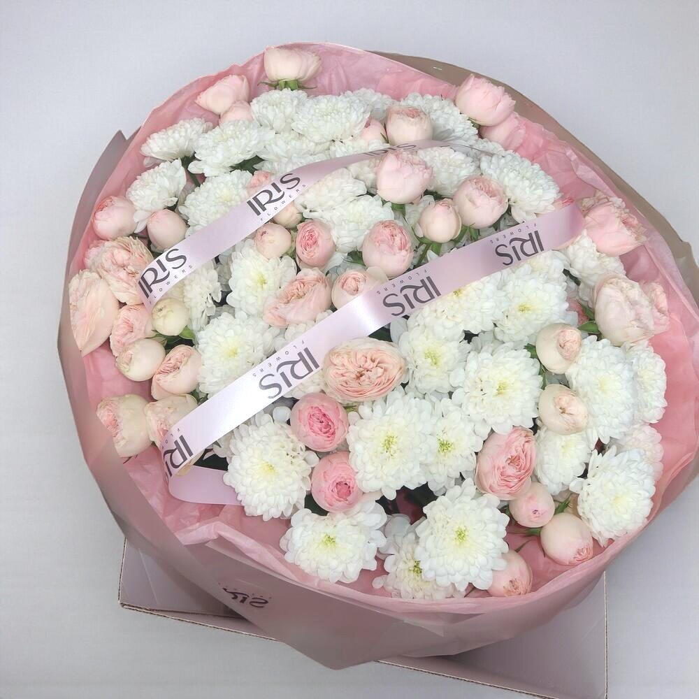 Этот нежный букет словно облако из элегантных белых хризантем и воздушных розовых пионовидных роз. Он излучает романтику, лёгкость и изысканность, идеально подойдёт для поздравления с особым событием или как трогательный знак внимания. Гармония белого и розового создаёт ощущение нежности и утончённости, а плотная форма букета придаёт ему роскошный и праздничный вид. Такой букет обязательно оставит тёплые воспоминания и подчеркнёт важность момента. Рекомендации по уходу: ставьте букет в чистую вазу с прохладной водой, обновляйте её ежедневно и подрезайте стебли под углом. Держите цветы вдали от прямых солнечных лучей и сквозняков. При желании хризантемы можно слегка опрыскивать водой для сохранения свежести.