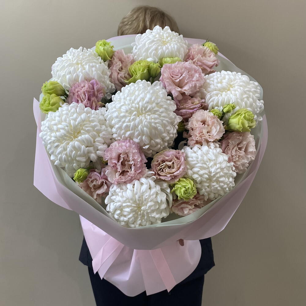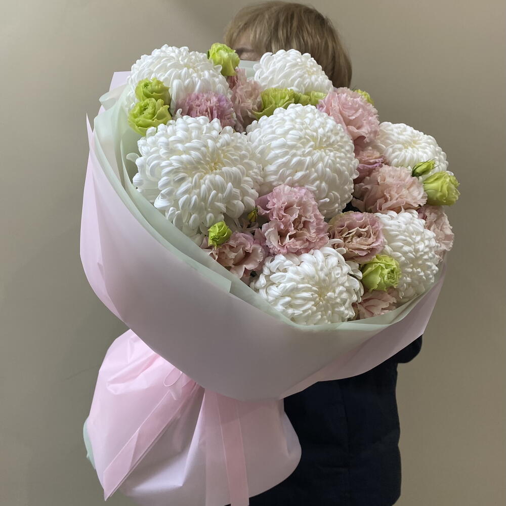 Белоснежные хризантемы в сочетании с пудрово-розовой эустомой и свежими салатовыми акцентами — этот букет про тишину, заботу и тепло. Он словно мягкое облако: объёмный, воздушный и очень тактильный. Идеален для тех моментов, когда слова лишние 💗
