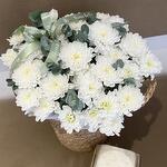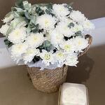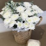 Белые хризантемы в кашпо/корзине с бенто тортиком, стойкость до 2-х недель, ароматные, бенто свежие и очень вкусные