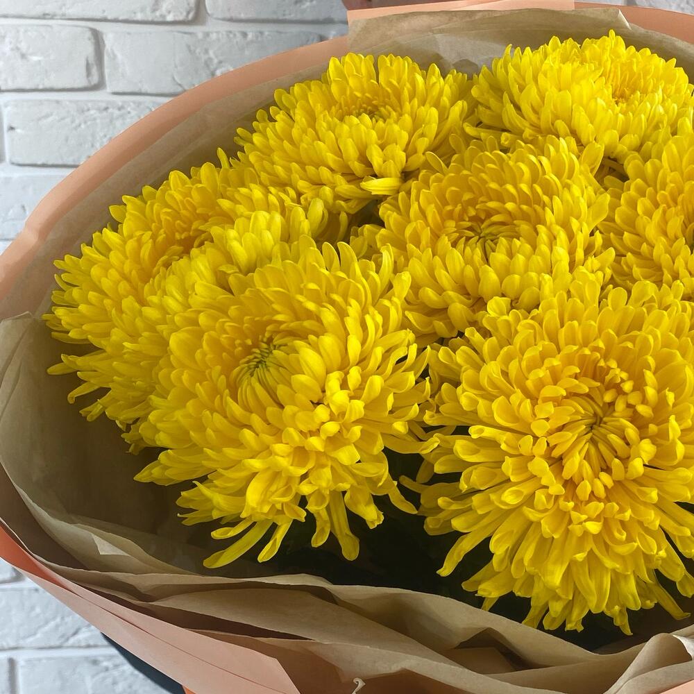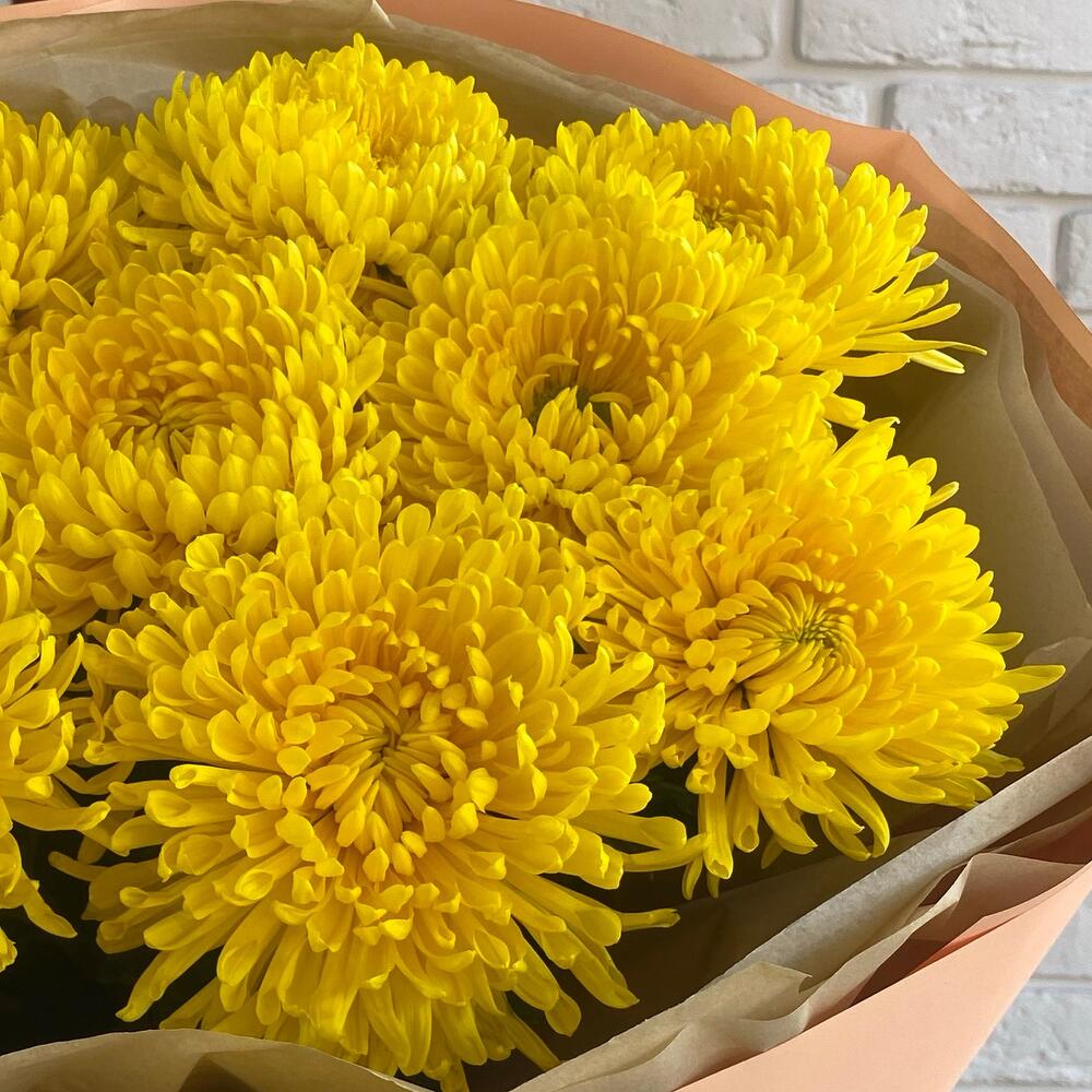 Хризантема одноголовая - 9 шт. Калька упаковка - 3 шт. оформление дизайнерское - 4 шт.