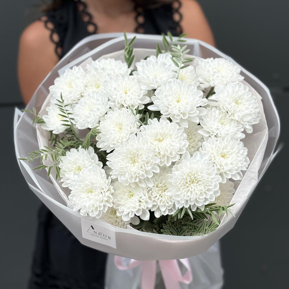 Захватывающий своей простотой и элегантностью монобукет из пяти штук пышных кустовых хризантем. Великолепный выбор для тех, кто ценит нежность и изящество в каждой детали. Этот букет станет стильным украшением каждого интерьера, а также подарит неповторимые эмоции его обладателю.