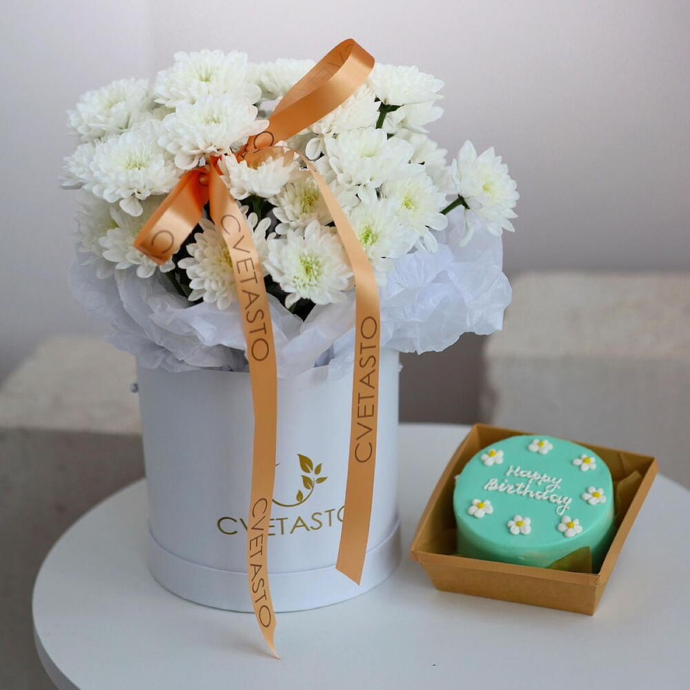 Хризантемы в коробке + бенто торт в подарок