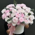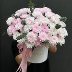 Хризантема кустовая - 13 шт. Эвкалипт - 3 шт. Оазис флористический - 1 шт. коробка флористическая - 1 шт.