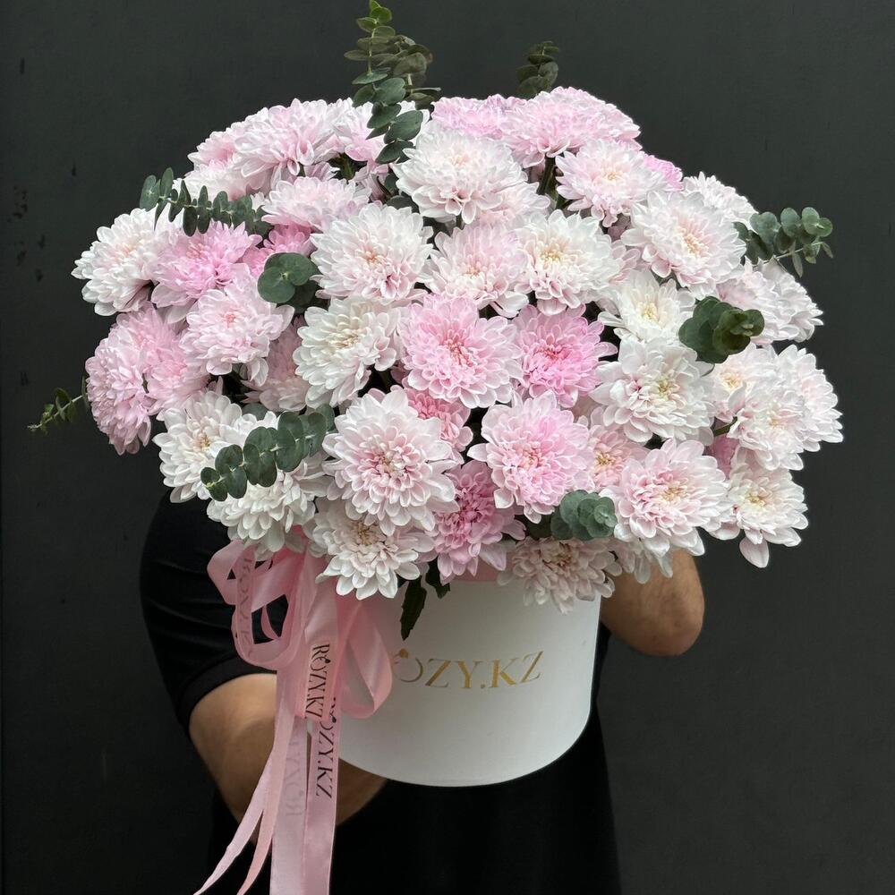 Хризантема кустовая - 13 шт. Эвкалипт - 3 шт. Оазис флористический - 1 шт. коробка флористическая - 1 шт.