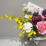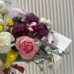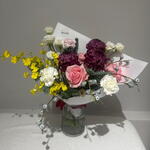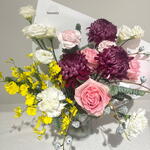 Нобилис - 3 шт. Диантус розовый - 2 шт. эустома белая - 3 шт. диантус белый сортовой - 2 шт. переноска для цветов - 1 шт. плоды эвкалипта - 3 шт. онцидиум - 1 шт. хризантема бордовая бигуди - 3 шт.
