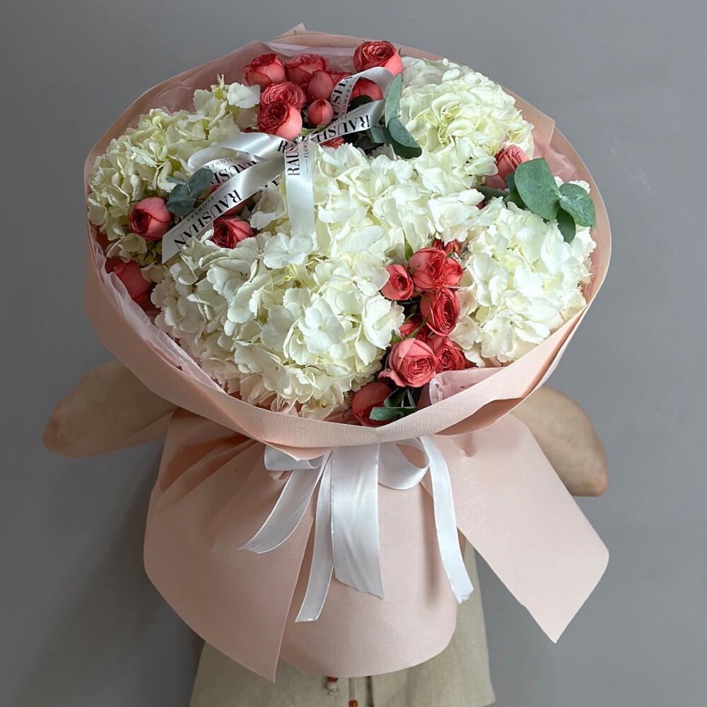 Гортензия - 5 шт. Эвкалипт - 1 шт. Кустовая роза - 5 шт.