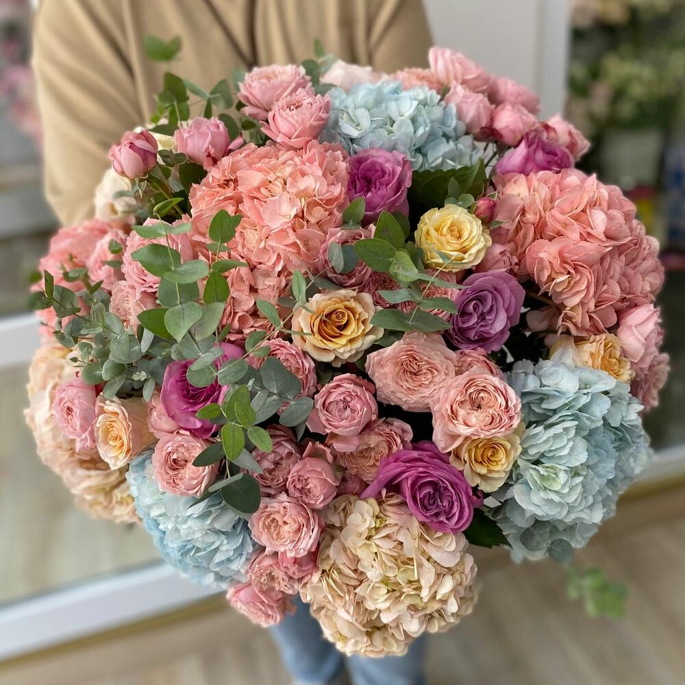Гортензия - 1 шт. Эвкалипт - 1 шт. Кустовая роза - 1 шт. Пионовидная роза - 1 шт.