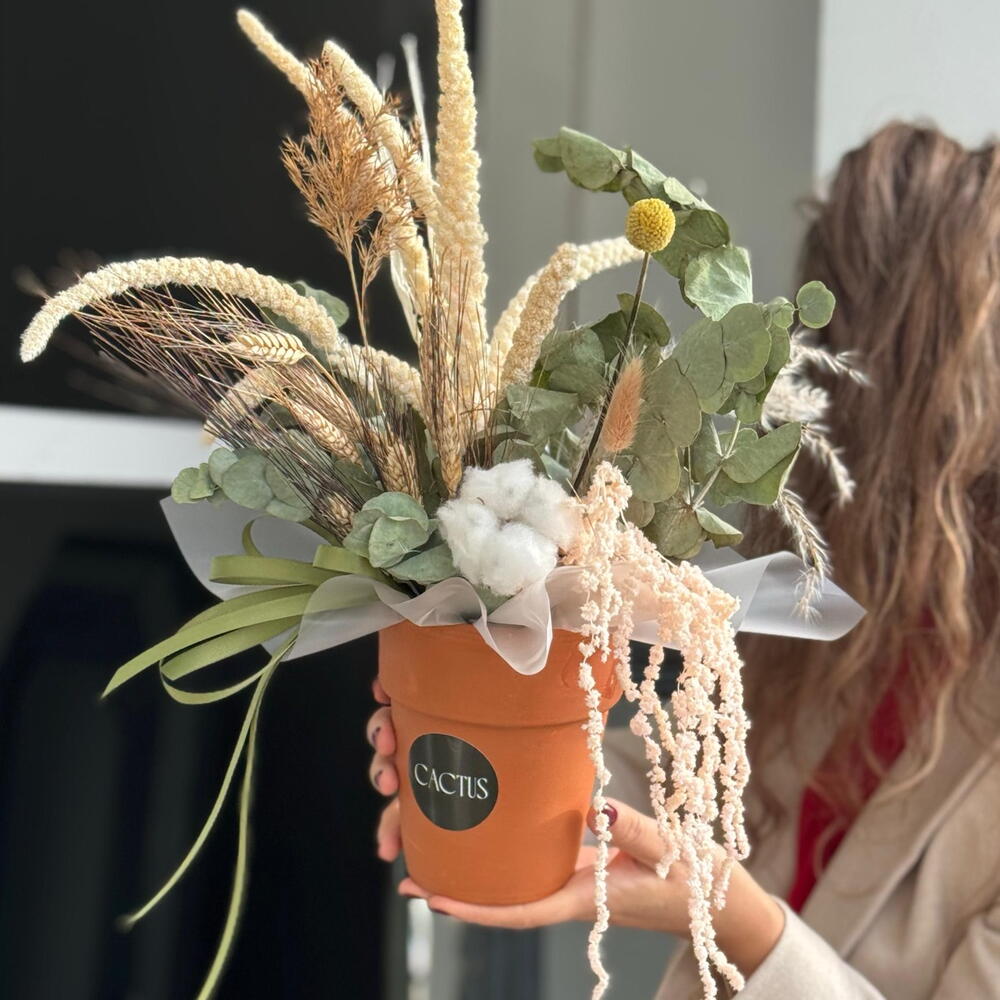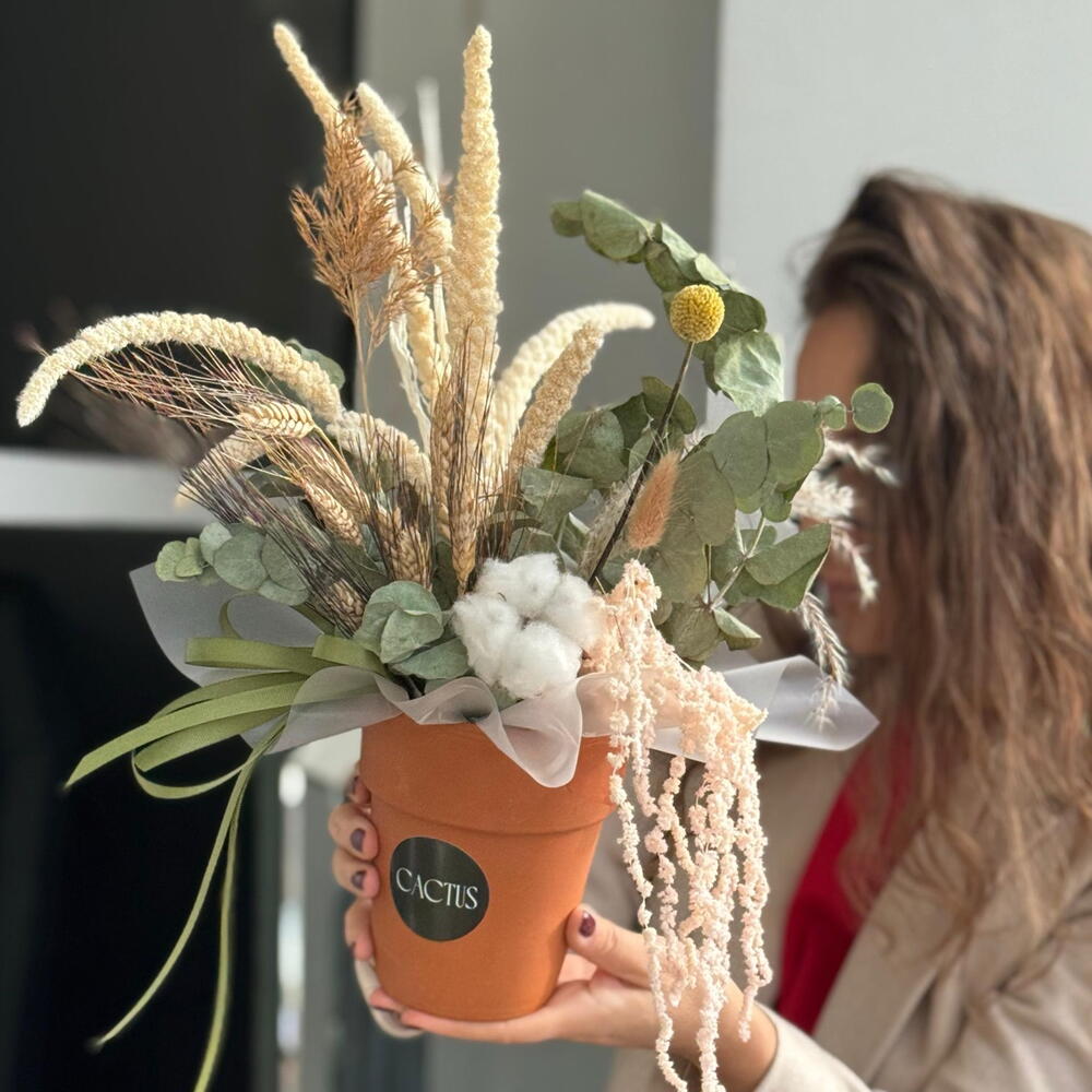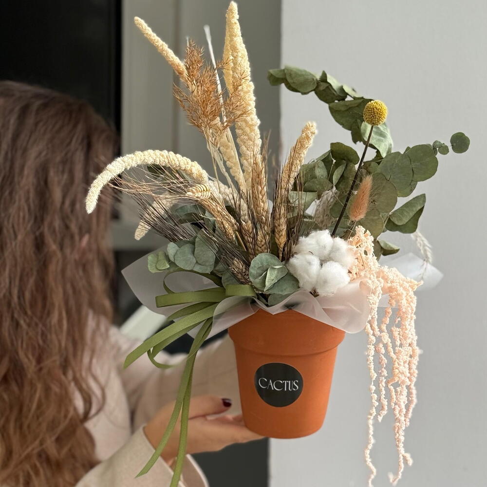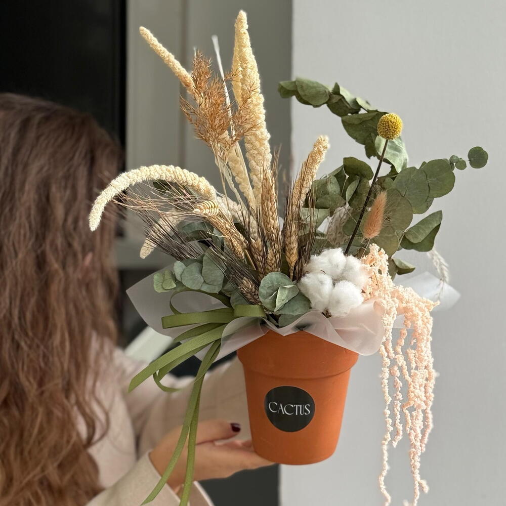 Краспедия - 1 шт. Хлопок - 1 шт. Упаковка - 1 шт. Кашпо - 1 шт. Оазис - 1 шт. Лагурус (сухоцвет) - 1 шт. пшеница сухоцвет - 9 шт. амарант сухоцвет - 1 шт.