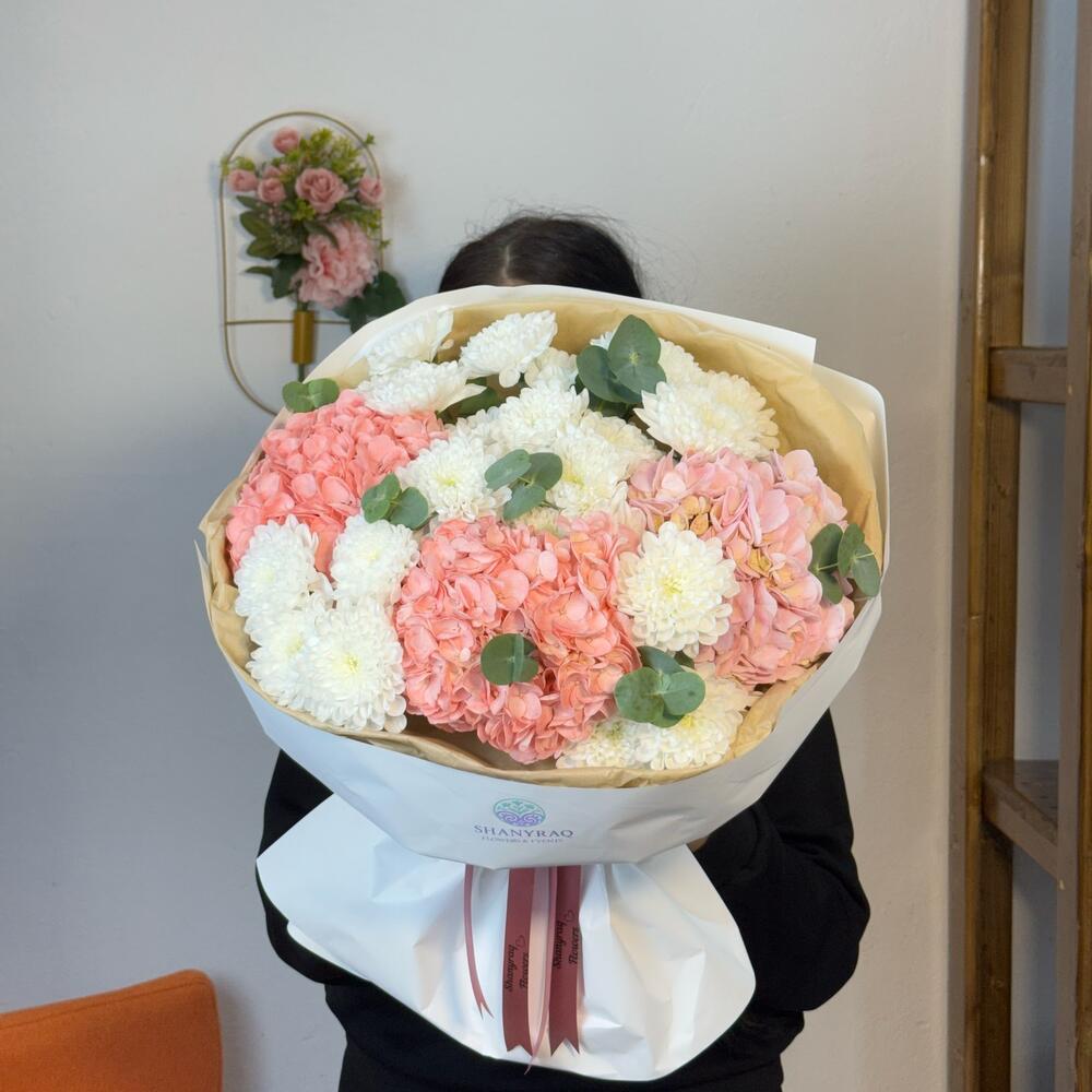 Гортензия - 3 шт. розы - 7 шт. хризантем - 3 шт.
