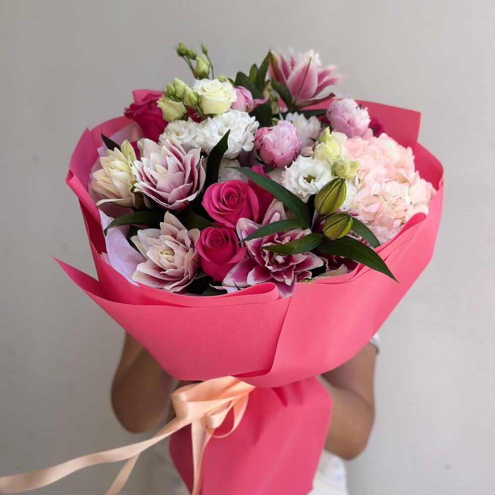 Гортензия - 1 шт. Лилия - 3 шт. Эустома - 3 шт. Упаковка дизайнерская - 10 шт. роза кустовая премиум - 3 шт.