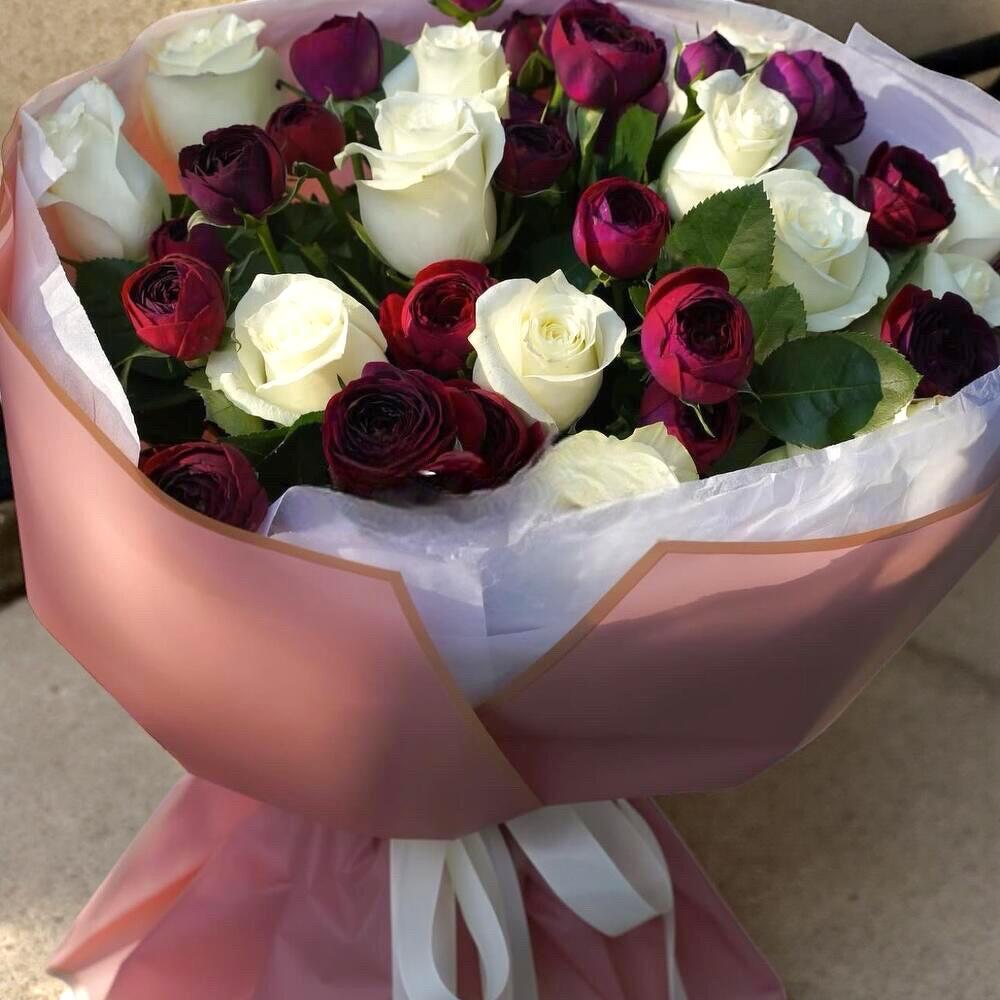Букет «Изысканный дуэт» из белых роз и бордовых ранункулюсов – Роскошный подарок из свежих цветов